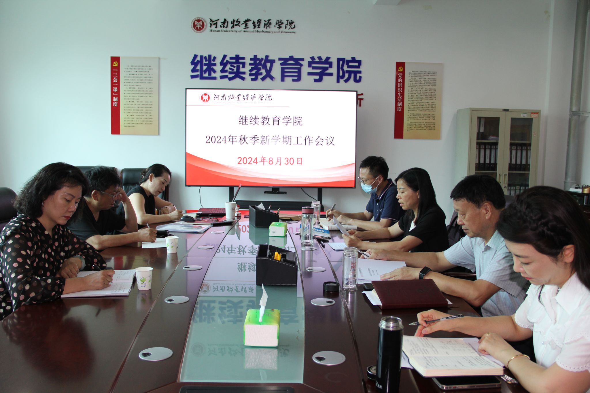张书记结合新学期工作提出几点要求:一是要提高政治站位,充分认识党的二十届三中全会的重大意义,深入学习领会好党的二十届三中全会精神,坚定全面深化改革的历史自信,切实把思想和行动统一到党中央决策部署上来。二是要强化责任担当,大力弘扬和自觉践行教育家精神,不断增强知责于心、担责于身、履责于行的使命感和自觉性,加强理论业务学习,探索工作规律,增强工作本领,把全部心思和精力投入到干事创业上,为推动学校继续教育事业高质量发展贡献应有之力。三是要树牢安全发展理念,全力做好校园安全工作,安全稳定工作意义重大、责任重大、使命重大,大家要坚持底线思维,防患于未然,结合各自工作岗位,切实履行好安全责任,紧盯苗头隐患,做好意识形态、防汛防火、网络安全等工作。